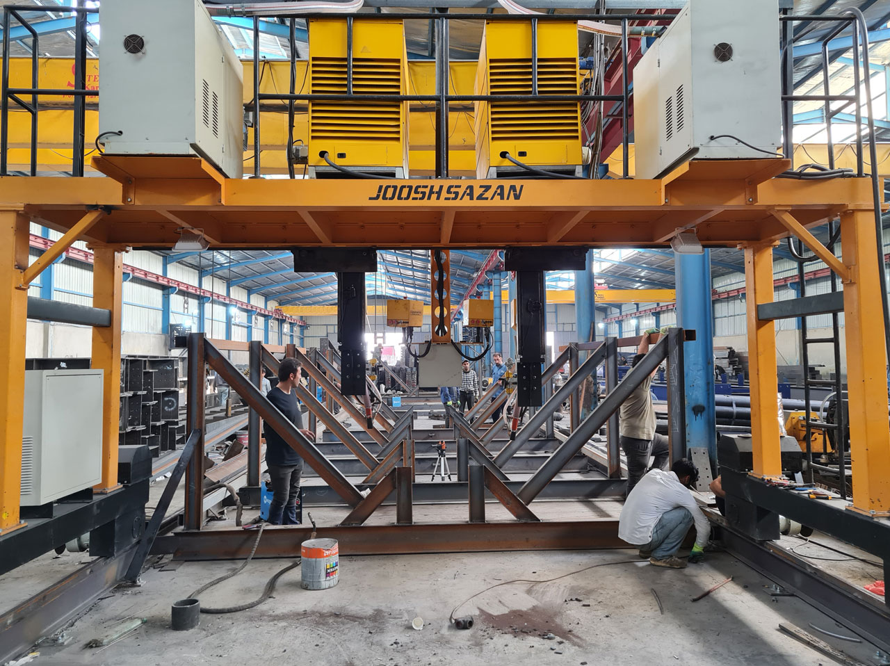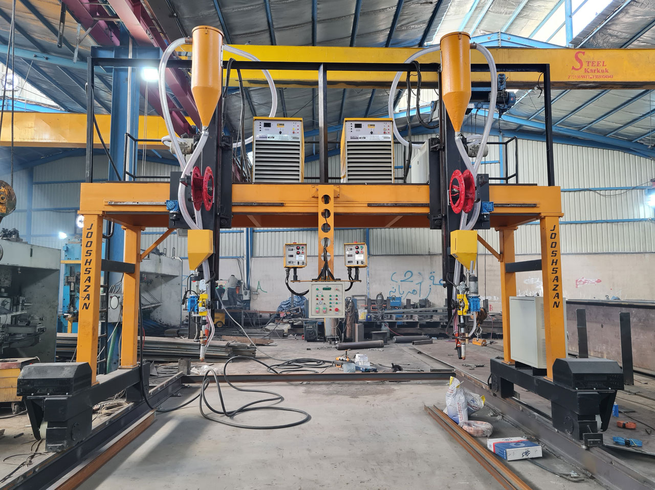 دستگاه جوش دروازه ای دارای دو دستگاه جوش زیرپودری و دو هدجوش زیرپودری برروی بوم عمودی است که می تواند جوش مقاطع H و BOX تخت و زاویه دار را انجام دهد.